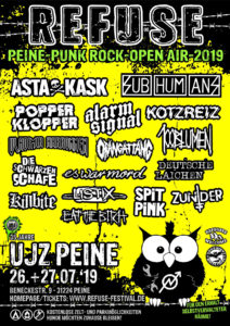 „Das REFUSE OPEN AIR geht am 26.+27. Juli 2019 in die 4. Runde und findet wie gewohnt im UJZ Peine statt. Zu sehen/hören gibts nen feinen Rundumschlag aus Punk in vielerlei Facetten, ner Prise Crust und nem Hauch Metal. Alles in korrekter Manier und mit viel Herz für die Sache, ehrenamtlich, handgemacht und non-profit. Findet euch gerne in gemütlich grüner Kulisse ein um scheißegeile Mucke zu feiern, nette Menschen wiederzutreffen bzw. kennenzulernen und ne schöne Auszeit aus dem Alltagstrott zu genießen.