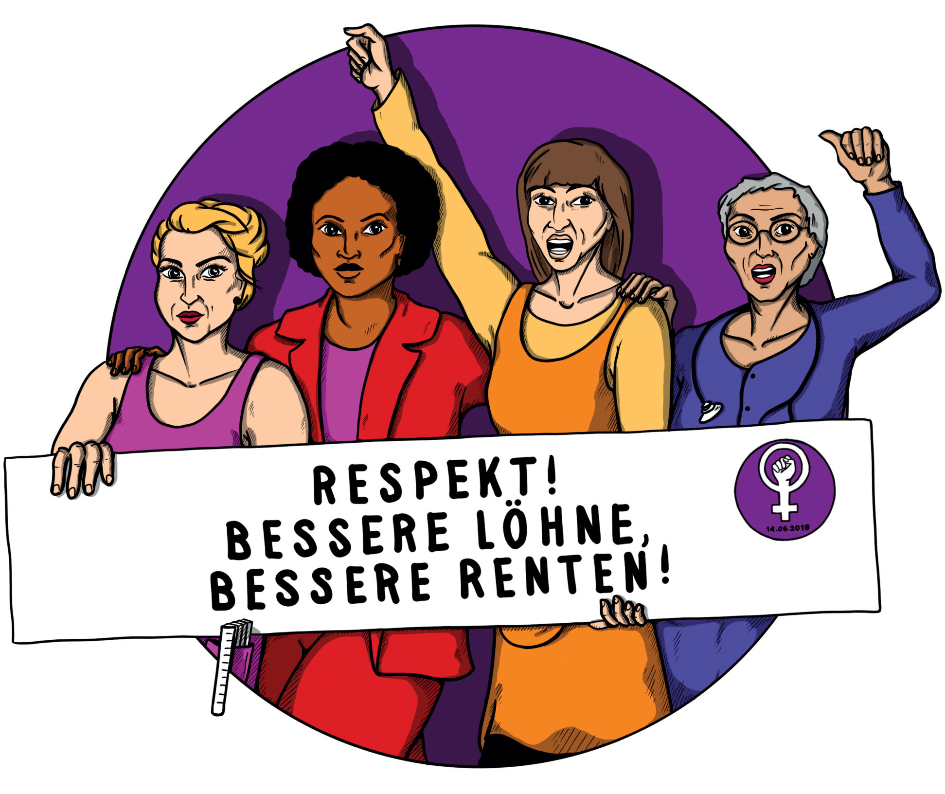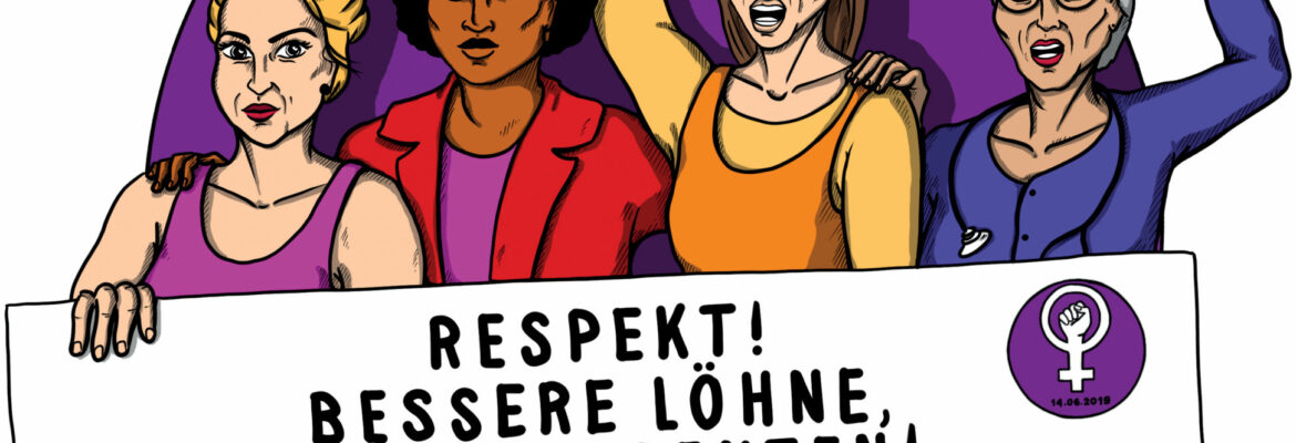Nicht nur um Lohn geht es, sondern auch um Respekt. Unser Körper gehört uns! Oder ist es normal, dass in der Schweiz alle 2 Wochen eine Frau ermordet wird? Ist es normal, dass wir Zoff riskieren nur weil wir eine Anmache nicht geil finden? Ist es normal, dass uns patriarchalische Institutionen sagen, ob wir abtreiben dürfen oder nicht? Und ab welchem Alter wir lieber mit der Tapete verschmelzen sollten? Wir sagen: NEIN!! Und zwar laut.