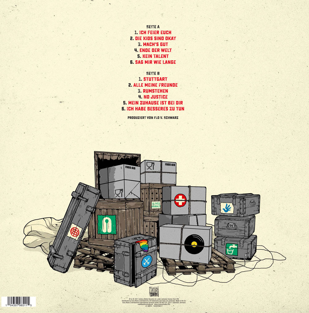 Man muss zum Cover und dem Titel immer die Rückseite dazu sehen. Das Flugzeug ist die Welt, die abstürzt. Wenn du Nachrichten schaust, denkst du, dass seit zwei drei Jahren alles auf so vielen Ebenen abfuckt. USA, AfD, dies das… Auf der Rückseite des Albums ist aber eine Palette mit Kisten und wichtigen Sachen für die Menschheit, die im letzten Moment noch mit dem Fallschirm abgeworfen und die sicher auf der Erde angekommen. Da sind Symbole von verschiedenen Initiativen, wie zum Beispiel Ende Gelände und all die positiven politischen Sachen, die gerettet werden. Und das ist ja auch meine Ansicht der Welt: Klar denke ich oft daran, was das für ein Haufen Scheiße ist. Gleichzeitig finde ich, dass man auf die Leute schauen muss, die sich damit nicht abfinden, sondern die positiven Sachen anschauen. Und es passiert viel Positives. Man muss es nur auch sehen. Die BlackLivesMatter-Bewegung ist beispielsweise irre gut. Ein Wahnsinn, was da in den USA losgetreten wurde. Auch Ende Gelände finde ich beeindruckend und cool und die Fridays for Future-Kids finde ich total motivierend genau wie Greta Thunberg, die den Politikern in den Arsch tritt. Und natürlich die ganzen Antifa-Gruppen, die seit 30 Jahren in ihren Orten die Recherche und Demos machen und wo immer noch neue Leute nachkommen. Wenn man das alles sieht, denke ich mir, dass da doch auch ganz viele tolle Sachen passieren. Das spiegelt sich in unserer Musik halt wider. Nicht an der Welt verzweifeln, sondern jetzt erst recht Support für die Leute, die versuchen, etwas Gutes zu tun. Das ist die Idee dahinter.