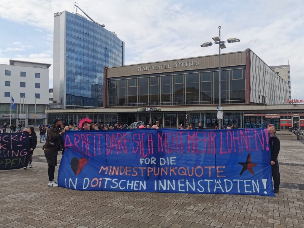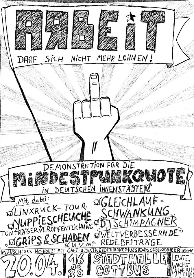 Yuppiescheuche hat Release und organisiert zur Feier des Tages eine Punkrock-Demo durch die Innenstadt von Cottbus. „Arbeit darf sich nicht mehr lohnen! Für die Mindestpunk-Quote in doitschen Innenstädten„ ist das Motto. Die Meute besteht aus 50-70 Leuten. Ich wurde im Vorfeld gefragt, ob ich für die satirische Verleihung des „Browntown-Awards“ einen AfD-Politiker spielen könnte. Ich hab Lust und nehme Preise entgegen – ausgezeichnet werden Orte in Cottbus, die sich auf besondere Art und Weise „verdient“ gemacht haben. Z.b. das Resaturant „Mosquito“ für das beste Nazi-Catering, usw…