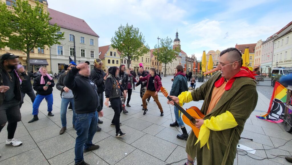 Im Osten sieht’s finster aus…AfD dies das. Nicht nur im Osten, aber da wird gewählt. Wir wollen was machen und entscheiden mal eben, ein Projekt zu starten und das innerhalb von drei Monaten aus dem Boden zu stampfen. Wir fahren nicht nach Leipzig oder Berlin….nee, wir fahren nach Greiz und Finsterwalde und das fühlt sich gut an. Die Stammtischkämpfer:innen sind dabei und machen Workshops, damit wa das Argumentieren mal bisschen lernen auch. Yuppiescheuche ist Solist und ich finde seine Musik so toll bodenständig und gleichzeitig idealistich. Und wir mit de Band dann eben auch.