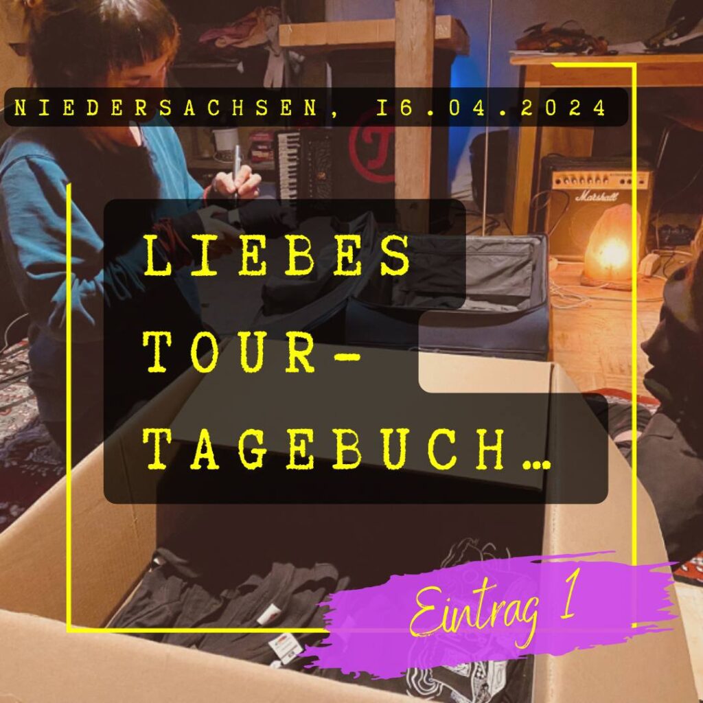 Socken in Rucksack stopfen, noch ne Mail schreiben, die eine Stelle nochmal proben. Aber jetzt, aufn Abend, ist’s eigentlich ganz gemütlich: Die Band sitzt aufm Dachboden. T-Shirtrs rollen und beschriften, Alben zusammenfalten (DIY und so) und im Hintergrund läuft Doktor Rabe. Schwer, so’n Tagebucheintrag zu schreiben, bei der Musik – denn da willste eigentlich zuhören 🙂