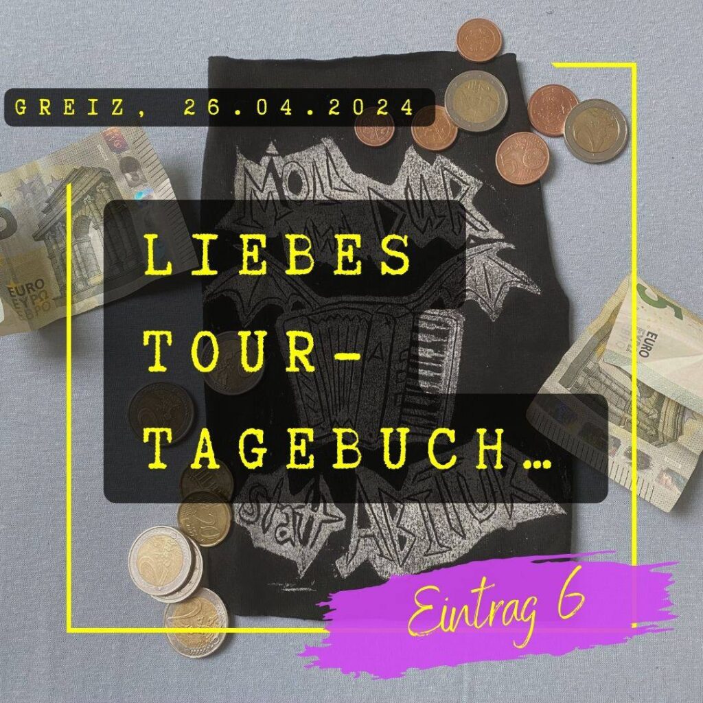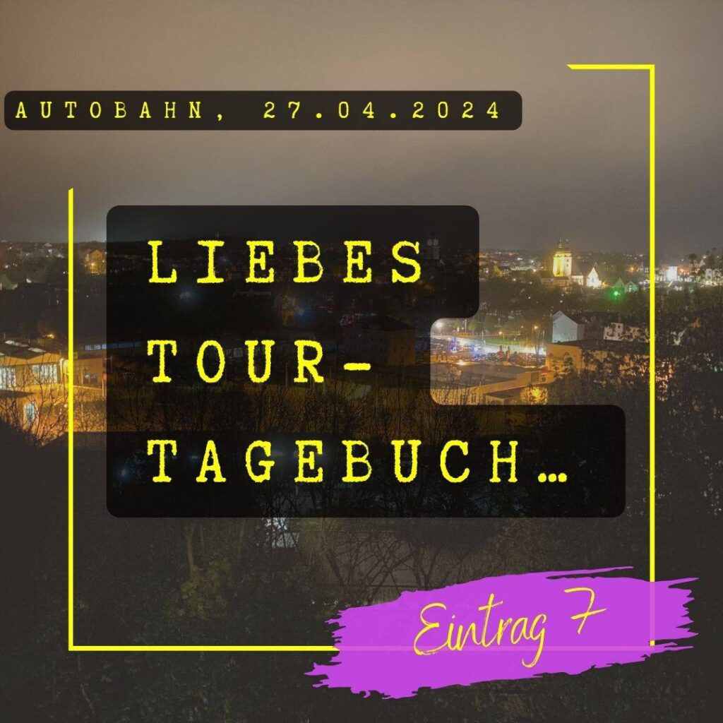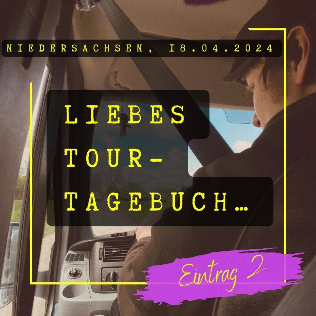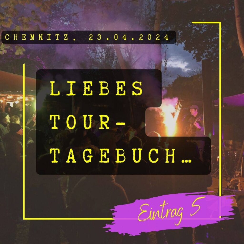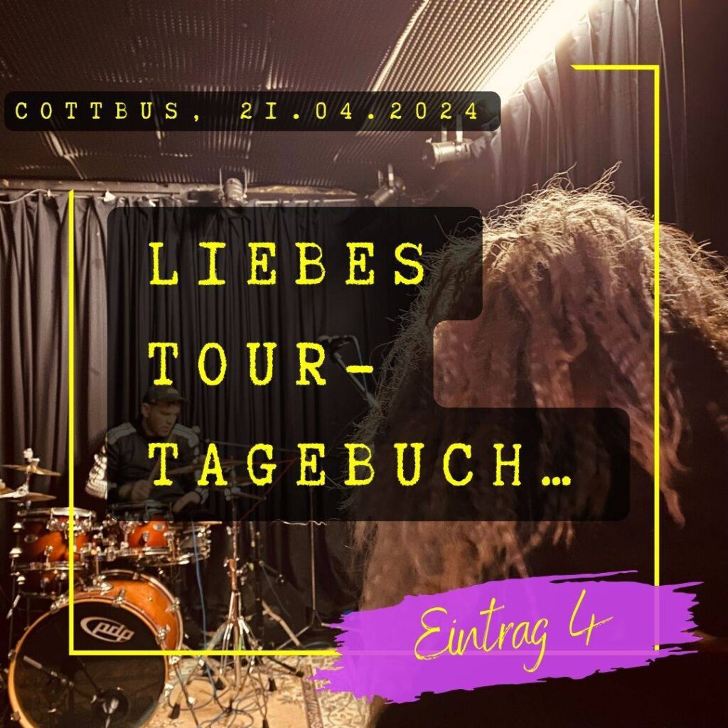 Wohzimmer, Sofa, Kaffee, Heizlüfter – wir sehen zerschossen aus. Seit Mittwoch gab es kaum mal einen Moment Pause. Aufstehn, losfahrn, Konzerte spieln und schlafen gehen. Irgendwo gibt es immer was zu bereden, oder „wir können die Pause ja kurz nutzen, um…“ Unsre Nervenkostüme zu Brei gekloppt von Schlagzeug-Soundchecks. Wiederkehrende Ohrwürmer der eigenen Lieder wühlen sich durch die dicke Luft der Gruppenschlafräume bis in deine Träume.