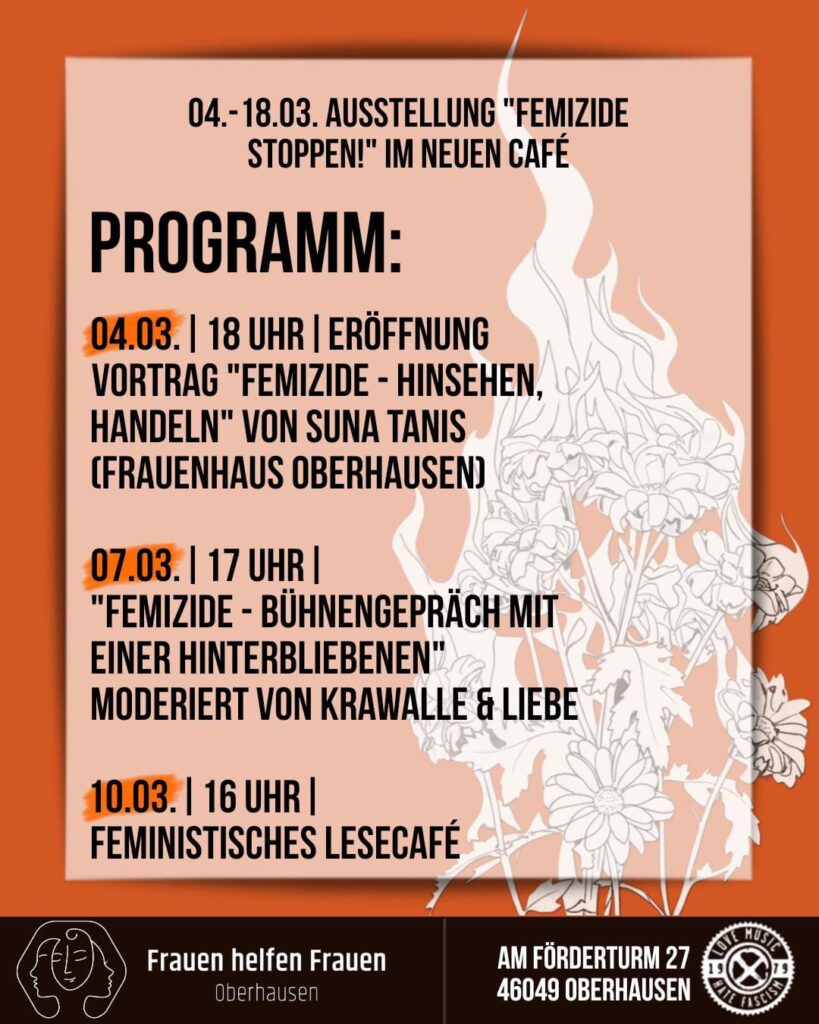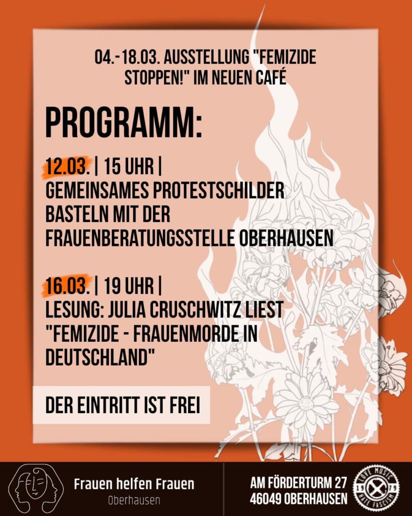 Rund um den Frauenkampftag finden bei uns in Kooperation mit dem Frauenhaus Oberhausen und der Frauenberatungsstelle eine Aktionswoche gegen Gewalt an Frauen statt. Dazu stellen wir im Neuen Café alle von @femizidestoppen gesammelten Fälle 2025 aus und schauen auf das letzte Jahr zurück.